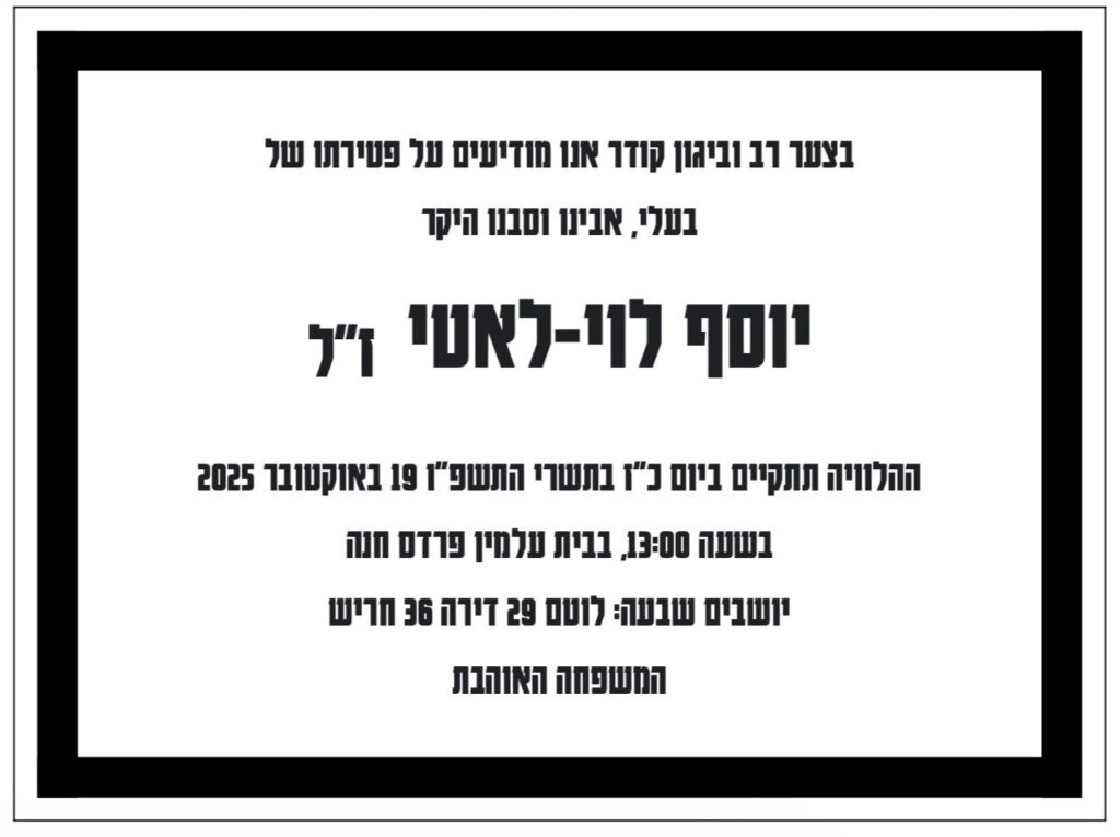 הלווייתו של יוסי לאטי תהיה מחר (ראשון) בשעה 13:00 בבית העלמין בפרדס חנה. המשפחה תשב שבעה בבית המנוח, רחוב לוטם 29, דירה 36 בחריש.