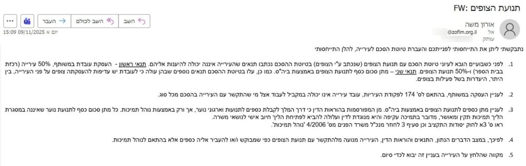 גורם בעירייה מוסיף כי בשיחות עם הורי הצופים עלה הסבר כי הדרישות הלא שגרתיות נבעו ממשבר אמון שנוצר בין התנועה לעירייה בעת סגירת השבט ב־2024. לטענתם, העירייה דאז לא הראתה רצון אמיתי לסייע, ולכן הצופים ביקשו כעת "עוגן" חזק יותר בהסכם. אך מבחינה משפטית העוגן הזה פשוט אינו אפשרי.