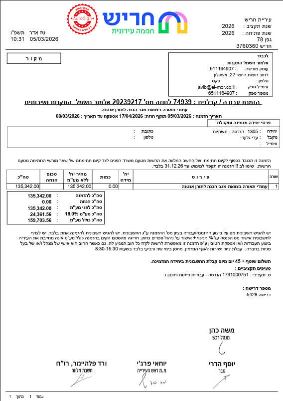 העבודות כוללות את שלב ההכנה להקמת התורן באמצעות קבלן חיצוני, בהיקף של כ-159 אלף ש"ח, וכוללות את כלל התשתיות הנדרשות להצבת האנטנה.
